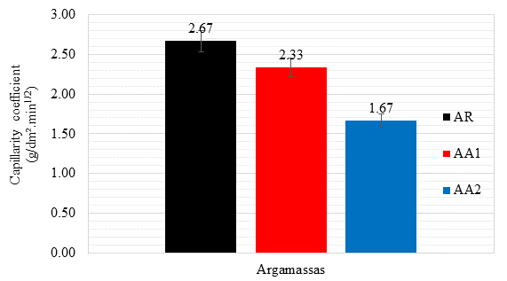 The higher the admixture content, the lower the capillarity coefficient and, consequently, the lower the capillarity absorption for a fraction of time. As in the previous data, the AA2 mixture presented the best results, reaching a coefficient about 37.5% lower than the RA, while AA1 reached a reduction of 12.7% compared to the RA.