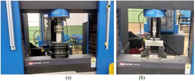 La prueba de resistencia a la compresión se realizó con probetas cilíndricas según el procedimiento establecido en NBR 7215 (ABNT, 2019) y la prueba de resistencia a la flexión y tracción se realizó según NBR 13279 (ABNT, 2005), empleándose las probetas prismáticas, ambas en prensa hidráulica, registradas en la Figura 4.