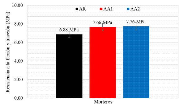 | Figura 7. Resultados de los ensayos de resistencia a la flexión y tracción (MPa) de los morteros a los 28 días. | ||||