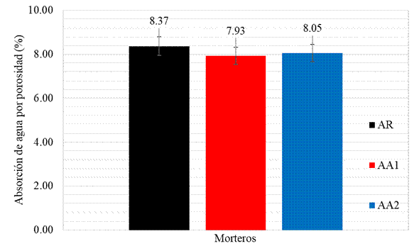 | Figura 9. Resultados de los ensayos de absorción de agua por porosidad o absorción de agua bajo presión (%) en probetas de morteros sumergidos en agua a los 28 días. | ||||