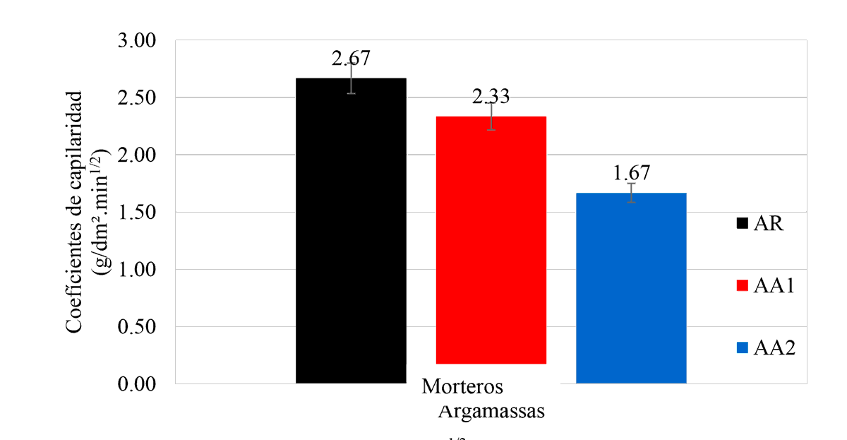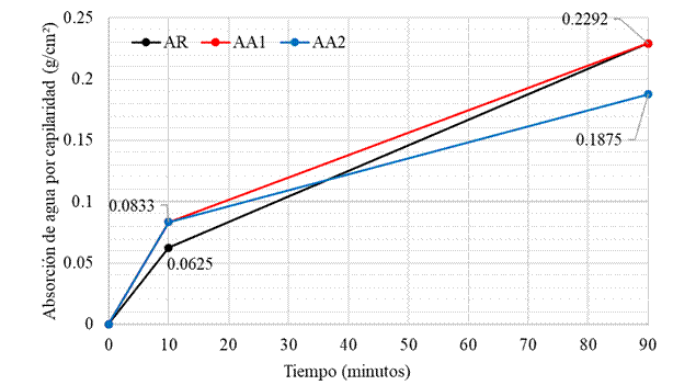 Se observa que cuanto mayor sea la cantidad de aditivo empleado en la mezcla, menor será el coeficiente de capilaridad y, por lo tanto, menor será la absorción por capilaridad en una fracción de tiempo. Al igual que en los datos inmediatamente anteriores, la mezcla AA2 presentó el mejor resultado, alcanzando un coeficiente aproximadamente un 37,5% menor que el AR, mientras que AA1 logró una reducción del 12,7% con relación al AR.