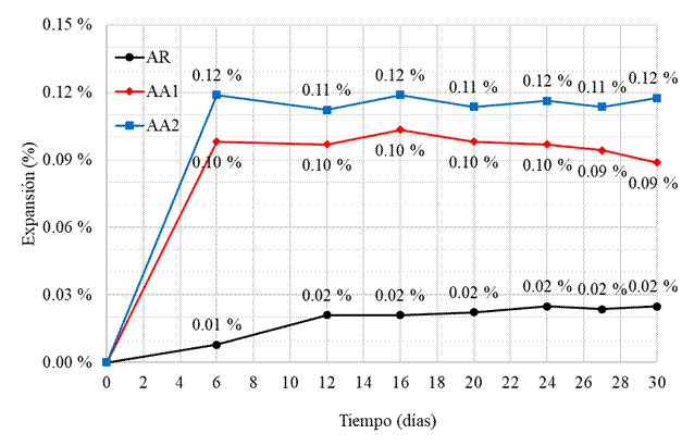 Las diferencias entre las variaciones del mortero son significativas, donde AA2 mostró una expansión inicial, a los 6 días, aproximadamente 1100% mayor que AR, mientras que AA1 registró una variación alrededor de 900% mayor que AR. Sin embargo, transcurrido este período de 6 días, la evolución de las expansiones cesa y las dimensiones de las probetas se estabilizan y, en consecuencia, estos porcentajes disminuyen en función del tiempo y descienden al 500% y 350%, respectivamente.