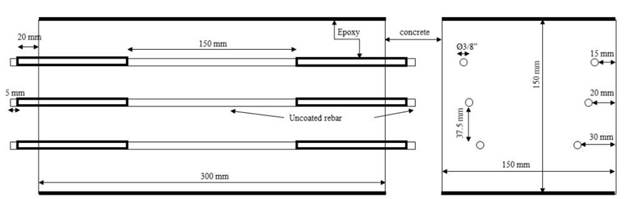 Using the ACI design method (ACI 211-91, 2002), twelve prismatic specimens (150x150x300 mm) were made using Portland Compound Cement (CPC30R) standardized by Mexican standard (NMX-C-414-ONNCCE, 2014), and limestone rock aggregate typical of southeast Mexico. Table 1 shows the basic characteristics of concrete: curing, storage condition, type of cement, and water/cement ratio, and Table 2 the dosage of concrete. Each specimen was reinforced with six, 42-grade, 3/8” diameter carbon steel bars (350 mm long), placed at depths of 15, 20 and 30 mm. Before placement in the specimens, the study area was marked on each bar, leaving a 150 mm long clear area in its center. The remaining bar was painted with epoxy paint and its end covered with isolating tape (Figure 1).