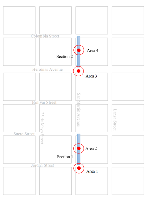 Two sections were considered as case study: the first was located on San Martin Avenue between Jordan and Sucre Streets, where Palace of Justice is across from 25 de Mayo Market, and the second was on San Martin Avenue between Heroinas Avenue and Colombia Street where many stores and optical shops are located.