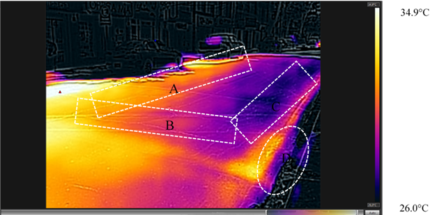 This technique shows low thermal gradients on cloudy days as opposed to sunny days including high temperatures. Sudden temperature changes during monitoring activities reveal discontinuous data that are detrimental to analysis of damage behavior in flexible pavement, most of all regarding preliminary inspections. Implementing active infrared thermography and other non-destructive tests may reduce these uncertainties and generate more objective results.