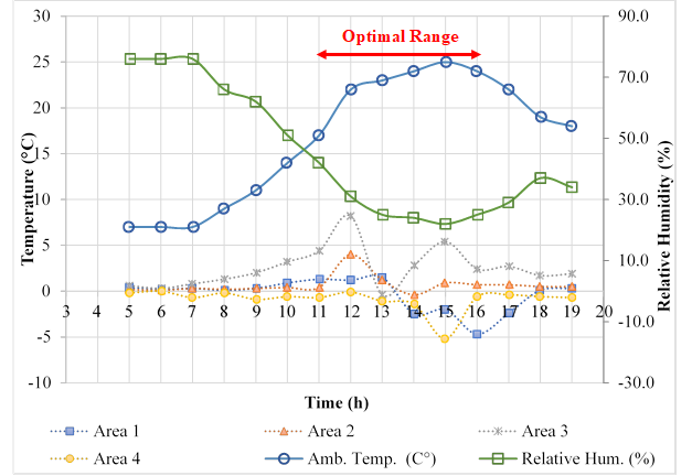 Regarding thermal gradient behavior with ambient temperature and relative humidity, it can be observed that maximum gradients occur when ambient temperature is high and relative humidity is low. Otherwise, when ambient temperature is low relative humidity is high, lower thermal gradients are present, 5:00 a.m. to 8:00 a.m., which confirm this technique is sensitive to environmental conditions (Rocha & Póvoas, 2017).