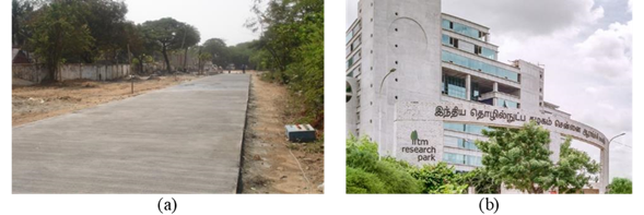 FRC pavement on IIT Madras campus, and (b) the SCC building in the IIT Madras Research.