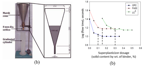 The presence of SCMs could increase the superplasticizer demand to achieve the required flow or workability. They could also affect the evolution of the various rheological characteristics as a function of time. Consequently, the flow responses of the blended binder system would differ significantly from that of an ordinary portland cement (OPC) system with the same water-binder ratio (w/b), depending mainly on the particle size distribution and particle shape of SCMs. A simple method such as Marsh Cone test has been used extensively to assess the variations in the behaviour of cement pastes with various superplasticizers and SCMs (Jayasree and Gettu, 2008, 2012; Jayasree et al., 2011; John and Gettu, 2014). Figure 2 shows the flow time (in log scale) versus the superplasticizer/binder dosage for pastes with (i) OPC, (ii) OPC with 30% replacement with fly ash (i.e., FA30), and (iii) limestone calcined clay cement (LC3) pastes; all with w/b = 0.40 and a PCE based superplasticizer (Nair, 2018). The flow times corresponding to the saturation dosage of superplasticizers (indicated by vertical lines in Figure 2b) for the pastes with FA30 and LC3 pastes are higher than that for OPC paste. These results show that the mortars and concretes made with fly ash and limestone calcined clay systems would exhibit differences in flow response and workability (Jayasree and Gettu, 2010; Nair 2018). However, such challenges can be mitigated with the appropriate corrections in the mixture proportioning - i.e., by adjusting the paste, superplasticizer, and water content.