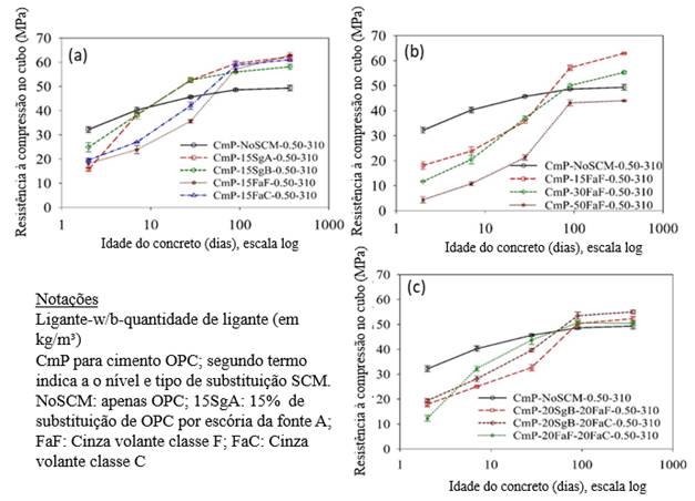 A resistência à compressão é provavelmente o parâmetro mais importante que influencia o desempenho estrutural dos sistemas de concreto. Assim, muitos pesquisadores investigaram o efeito dos SCMs na resistência à compressão do concreto. No entanto, ainda existem percepções e restrições negativas sobre o uso de SCMs para grandes projetos de infraestrutura, principalmente devido à falta de conhecimento das vantagens de tais materiais e às possíveis variações na qualidade e tipo de SCMs disponíveis de várias fontes. Para resolver essas questões, dados experimentais foram obtidos para concretos que são normalmente usados no setor de construção indiano para quantificar a evolução de suas resistências (Dhandapani et al., 2018; Sakthivel, 2019; Sakthivel et al., 2019).