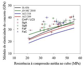Embora a resistência à compressão precoce dos concretos com cimentos mistos possa ser menor que a do concreto OPC, a Fig. 3 mostra que os valores eventuais podem ser muito mais altos, especialmente para níveis de substituição de 15% de cinzas e escórias (ver Fig. 3a e b). A Fig. 3c mostra que misturas ternárias com 60% de OPC, 20% de escória e 20% de cinza volante podem exibir maiores resistências à compressão em idades posteriores do que os concretos sem SCMs. Isso indica a necessidade de planejar adequadamente o cronograma de cura e remoção de fôrmas ao usar concretos com SCMs. A Fig. 4 mostra que os concretos com vários SCMs exibem um módulo de elasticidade adequado, conforme previsto por várias normas e códigos. No total, pode-se concluir que o desempenho de concretos à base de SCM é bom em termos de propriedades mecânicas.