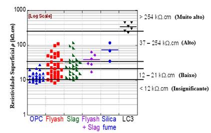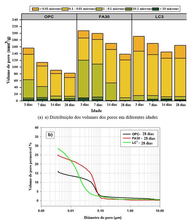 Os concretos com sistemas de ligantes misturados exibem uma estrutura de poros mais refinada do que os sistemas OPC, devido às reações hidráulicas e pozolânicas adicionais / prolongadas. Dhandapani e Santhanam (2020) realizaram extensos estudos sobre a evolução da microestrutura em ligantes com vários SCMs, especialmente sistemas LC3. A Fig. 7 mostra a evolução dos tamanhos dos poros em pastas de cimento endurecidas com uma relação p/b de 0,35 e preparadas com (i) OPC, (ii) OPC com cinza volante (na dosagem de substituição de 30%) e (iii) LC3. Os resultados indicam claramente que os SCMs de reação mais lenta, como a cinza volante, resultam em um retardo de cerca de 14 dias para exibir um refinamento significativo dos poros, enquanto os SCMs de reação mais rápida, como a argila calcificada com calcário, exibem poros muito mais finos, mesmo em 3 dias. A Fig. 7 (b) mostra as distribuições de tamanho de poro nos sistemas OPC, FA30 e LC3 aos 28 dias de cura. Uma lição importante é que os concretos com cinzas volantes exigirão uma cura prolongada para explorar todo o potencial. Um maior refinamento dos poros melhorará a resistividade do sistema, como visto na Fig. 8 para concretos com SCMs, em particular sistemas LC3. Consequentemente, a maior resistividade levará a uma melhor resistência ao cloreto e menores taxas de corrosão.