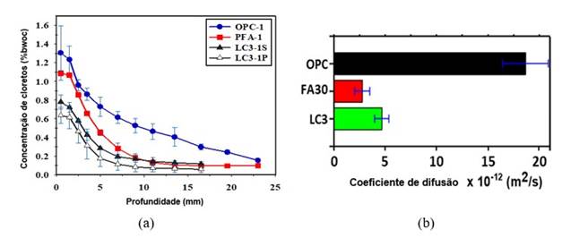 Muitos relatórios sugerem que a resistência dos concretos contra a entrada de cloretos pode ser bastante aprimorada usando SCMs. A estrutura de poros refinada e a capacidade aprimorada de ligação ao cloreto são as principais razões para isso. A Fig. 11a mostra perfis de cloretos (ensaios ASTM C1556) de concretos curados úmidos por 1 ano; as curvas para os sistemas FA30 e LC3 exibem declives mais íngremes do que os do sistema OPC - indicando menores coeficientes de difusão de cloreto e melhor capacidade de ligação ao cloreto, o que pode ser atribuído à maior concentração de alumina reativa nos SCMs. Além disso, os sistemas de cinzas volantes e LC3 exibem cerca de 75% nos coeficientes de difusão de cloreto (ver Fig. 11b), com os sistemas LC3 possuindo melhor capacidade de ligação ao cloreto do que aqueles com cinzas volantes. Pillai et al. (2018) e Dhandapani e Santhanam (2020) mostraram que o tipo SCM influencia bastante o fator de envelhecimento ou constante de decaimento para o coeficiente de difusão de cloreto. A escolha apropriada do fator de envelhecimento é importante para obter estimativas de vida útil mais realistas. Consulte a Tabela 2 para obter as faixas recomendadas de fatores de envelhecimento para vários sistemas de ligantes; para ser conservador, pode-se escolher um valor mais baixo no intervalo indicado. Por exemplo, para sistemas com OPC, cinzas volantes Classe F, cinzas volantes Classe C, escória e LC3, recomenda-se o uso de fatores de envelhecimento de 0,1, 0,6, 0,4, 0,4 e 0,4, respectivamente, para a estimativa inicial da vida útil. As estimativas de vida útil podem ser refinadas coletando amostras de campo para obter perfis de cloreto e, em seguida, determinando os coeficientes de difusão de cloreto e os fatores de envelhecimento em idades posteriores.