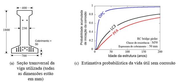 No entanto, deve-se notar que alcançar uma longa vida útil é uma consequência do efeito sinérgico de muitos parâmetros (principalmente o coeficiente de difusão de cloreto, fator de envelhecimento e limiar de cloreto). Para demonstrar o potencial de melhorar a vida útil de estruturas de concreto armado sob exposição a cloretos através da incorporação de ligantes misturados, uma viga de ponte (veja Fig. 13(a)) com uma espessura de cobrimento (d) de 50 mm e exposta para uma concentração de cloreto na superfície de 0,8% em peso de aglutinante. As probabilidades acumuladas de iniciação à corrosão foram obtidas usando a solução da 2ª Lei de Difusão de Fick, em um programa MATLAB® SL-Chlor, considerando d, Dcl e Clth como variáveis aleatórias (Pillai et al. 2018; Rengaraju, 2019). A Fig. 13(b) mostra que os sistemas baseados em SCM geralmente podem proporcionar uma vida útil muito mais longa do que os sistemas OPC.