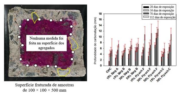 A resistência à penetração de CO2 geralmente é boa nos sistemas OPC, devido ao alto teor de hidróxido de cálcio. No entanto, devido a reações pozolânicas prolongadas, os concretos baseados em SCM exigem teores mais baixos de hidróxido de cálcio e, consequentemente, menor resistência à carbonatação. Devido à menor disponibilidade de Ca(OH)2 em sistemas baseados em SCM, o CO2 é capaz de carbonatar o CSH em um momento anterior - levando à rápida progressão da frente de carbonatação. Dhanya (2015) mostrou, a partir de estudos de carbonatação acelerada com menos de 1% de CO2, que as profundidades de carbonatação em concretos com mais de 15% do OPC substituído por cinzas volantes de Classe F poderiam ser muito maiores do que apenas o OPC como ligante (ver Fig. 14) Por outro lado, o aumento da carbonatação das misturas substituídas por escória não foi significativo. Resultados de carbonatação natural de estudos recentes também mostraram maiores profundidades de penetração para concretos misturados com SCM. Portanto, pode-se esperar que o início da corrosão devido à carbonatação ocorra mais cedo nos concretos com SCMs, se expostos sem nenhum revestimento. No entanto, a propagação da corrosão ainda dependeria da disponibilidade de umidade e oxigênio, bem como da condutividade (ou inversamente, resistividade) do meio - espera-se que esses fatores compensem e produzam uma situação favorável aos SCMs. Considerando todos esses aspectos, é possível projetar efetivamente um concreto baseado em SCM para situações em que a carbonatação possa governar a durabilidade. Portanto, recomenda-se não abster-se de usar concretos com SCMs - os engenheiros poderiam adotar medidas de mitigação, como revestimentos anti-carbonatação, para compensar os efeitos adversos devido à carbonatação potencialmente mais rápida.