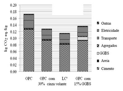 A substituição parcial do OPC por SCMs pode levar a uma redução significativa nas emissões de CO2 associadas à produção de cimento; e, portanto, a produção de concreto. Para quantificar os aspectos positivos relacionados à pegada de carbono e ao impacto ambiental dos concretos com ligantes misturados, investigações extensivas foram realizadas no IIT Madras usando a avaliação do ciclo de vida (ACV) realizada com dados de várias fábricas de cimento na Índia (Gettu et al., 2016, 2018, 2019). A Fig. 15 mostra as emissões de CO2 obtidas para um dos estudos de caso considerando os concretos M50. Esses valores estão nas faixas relatadas na literatura; por exemplo, Flower e Sanjayan (2007) forneceram valores de cerca de 0,13 kg/kg para concreto OPC, e os valores de carbono incorporados dados por Hammond e Jones (2008) produzem emissões de CO2 de 0,13-0,16 kg/kg. Mais importante, as parcelas indicam que em concretos com apenas OPC, mais de 75% das emissões de CO2 estão associadas ao cimento, enquanto a maioria dos 25% restantes das emissões de CO2 está associada ao transporte e eletricidade. Isso também está de acordo com as observações de Flower e Sanjayan (2007) e Marceau et al. (2007). Após a substituição do OPC por SCMs ou ligantes misturados, é observada uma redução significativa nas emissões. Observa-se que o uso de cinzas volantes e GGBS diminui as emissões de CO2 em cerca de 26% e 21% - semelhante às faixas relatadas por Flower e Sanjayan (2007). Os concretos LC3 são muito promissores em termos de emissões de CO2, com uma redução de 30 a 35% em comparação com os concretos OPC com resistências à compressão semelhantes. Em geral, o uso de SCMs disponíveis localmente em doses mais altas leva a uma redução significativa na pegada de carbono da indústria de concreto.