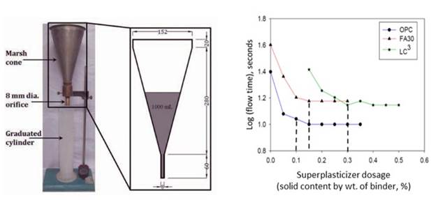 La presencia de SCMs podría aumentar la demanda de superplastificante para lograr el flujo requerido o la trabajabilidad. También podrían afectar la evolución de las diversas características reológicas en función del tiempo. En consecuencia, las respuestas de flujo del sistema aglutinante mezclado diferirían significativamente de las de un sistema de cemento portland ordinario (OPC) con la misma relación agua-material cementante (a/mc), dependiendo principalmente de la distribución del tamaño de partícula y la forma de partícula de los SCM. Un método simple como la prueba del cono de Marsh se ha utilizado ampliamente para evaluar las variaciones en el comportamiento de las pastas de cemento con varios superplastificantes y SCM (Jayasree y Gettu, 2008, 2012; Jayasree et al., 2011; John y Gettu, 2014). La Figura 2 muestra el tiempo de flujo (en escala logarítmica) versus la dosificación de superplastificante / aglutinante para pastas con (i) OPC, (ii) OPC con 30% de reemplazo con cenizas volantes (es decir, FA30), y (iii) pastas de cemento de arcilla calcinada con piedra caliza (LC3); todo con a/mc = 0.40 y un superplastificante basado en PCE (Nair, 2018). Los tiempos de flujo correspondientes a la dosificación de saturación de superplastificantes (indicada por líneas verticales en la Figura 2b) para las pastas con pastas FA30 y LC3 son más altas que las de la pasta OPC. Estos resultados muestran que los morteros y hormigones fabricados con sistemas de cenizas volantes y arcilla calcina caliza exhibirían diferencias en la respuesta al flujo y la trabajabilidad (Jayasree y Gettu, 2010; Nair 2018). Sin embargo, tales desafíos pueden mitigarse con las correcciones apropiadas en la proporción de la mezcla, es decir, ajustando la pasta, el superplastificante y el contenido de agua.