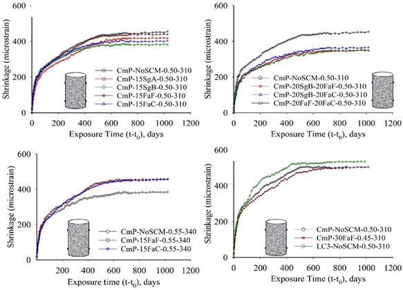 Las pruebas en curso en IIT Madras sobre la contracción de concretos con aglutinantes mezclados indican que la incorporación de SCM no altera significativamente la evolución de la deformación por contracción por secado (ver datos de 4 años en la Figura 5). Se puede concluir que el reemplazo de OPC por ≤ 30% de escoria y cenizas volantes, al mismo peso, no cambiará las cepas finales debido a la contracción por secado. Esto es de considerable relevancia para las prácticas de diseño porque la mayoría de los modelos de contracción no proporcionan directamente disposiciones para la estimación de la contracción en hormigones con SCM. Los resultados también indican que los modelos de contracción calibrados para hormigones OPC (es decir, sin SCM) se pueden usar para hormigones con SCM, con alguna recalibración, si es necesario.