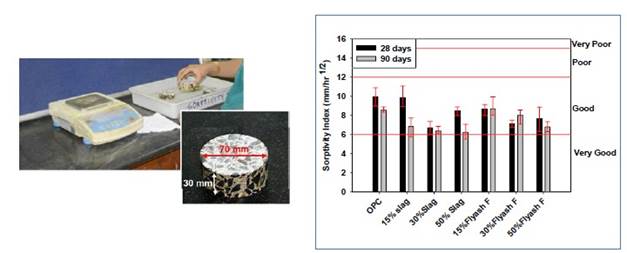 Debido a la estructura de poros refinada, los hormigones con SCM también exhiben una menor permeabilidad (Dhanya y Santhanam, 2017). La carga aprobada en la prueba rápida de penetración de cloruro es un buen indicador de la permeabilidad del hormigón; La Figura 9 indica la resistencia significativa a la transferencia de carga, especialmente cuando los niveles de reemplazo de escoria y cenizas volantes de Clase F son más del 30%. Por otro lado, el rendimiento de las cenizas volantes calcáreas (Clase C) tiene una calificación menor que la de las cenizas volantes y la escoria de la Clase F. Tener en cuenta que con un nivel de reemplazo del 15%, tanto la escoria como la ceniza volante Clase C exhiben un rendimiento similar. La Figura 10 muestra los datos de las pruebas de sorptividad del agua, lo que indica que los hormigones basados en SCM muestran una sorbilidad marginalmente menor que los hormigones OPC. La literatura tampoco proporciona ningún consenso sobre la capacidad de absorción de agua y la penetración de cloruros de los hormigones con SCM. Los autores creen que con las prácticas apropiadas de diseño de mezcla, colocación y curado, los aspectos positivos de los SCM pueden explotarse para mejorar la durabilidad de los sistemas de hormigón armado.
