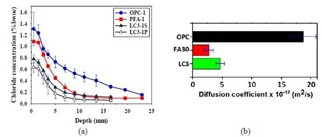 Muchos informes sugieren que la resistencia de los concretos contra la entrada de cloruro puede mejorarse en gran medida mediante el uso de SCM. La estructura de poros refinada y la capacidad mejorada de unión al cloruro son las principales razones para esto. La Figura 11a muestra los perfiles de cloruro (ensayos ASTM C1556) de concretos curados en húmedo durante 1 año; Las curvas para los sistemas FA30 y LC3 exhiben pendientes más pronunciadas que las del sistema OPC, lo que indica coeficientes de difusión de cloruro más bajos y una mejor capacidad de enlace de cloruro, que se puede atribuir a una mayor concentración de alúmina reactiva en los SCM. Además, los sistemas de cenizas volantes y LC3 exhiben aproximadamente el 75% en los coeficientes de difusión de cloruro (ver Figura 11b), con los sistemas LC3 que poseen una mejor capacidad de enlace al cloruro que aquellos con cenizas volantes. Pillai y col. (2018), y Dhandapani y Santhanam (2020) mostraron que el tipo SCM influye en gran medida en el factor de envejecimiento o constante de descomposición para el coeficiente de difusión de cloruro. La elección adecuada del factor de envejecimiento es importante para obtener estimaciones de vida útil más realistas. Consulte la Tabla 2 para conocer los rangos recomendados de factores de envejecimiento para varios sistemas aglutinantes; para ser conservador, uno puede elegir un valor más bajo en el rango dado. Por ejemplo, para sistemas con OPC, cenizas volantes de clase F, cenizas volantes de clase C, escoria y LC3, se recomienda utilizar factores de envejecimiento de 0.1, 0.6, 0.4, 0.4 y 0.4, respectivamente, para la estimación inicial de la vida útil. Las estimaciones de la vida útil se pueden refinar recolectando muestras de campo para obtener perfiles de cloruro y luego determinando los coeficientes de difusión de cloruro y los factores de envejecimiento en edades posteriores.