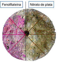 Después de ese procedimiento, en una mitad de la sección transversal de cada una de las cuatro partes, se aplicó una solución de fenolftaleína en la proporción de 5 g de fenolftaleína para 276,15 g de alcohol etílico, para 150 g de agua destilada. En la otra mitad se aspergió la solución de AgNO3 con concentración de 0,10 mol/L. Se aplicó AgNO3 dos veces seguidas, para aumentar el contraste de colores entre las áreas con y sin cloruros, así como fue ejecutado en el trabajo de Baroghel-Bouny et al. (2007).