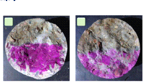 Después del período de inmersión/migración de cloruros, los elementos de hormigón fueron colocados en un horno a 40°C por 24 horas para secar, dispuestos para enfriar durante 1 día, y finalmente seccionadas para asperger las soluciones alcalinas. La solución alcalina fue aplicada para elevar el pH de la frente de carbonatación en la superficie recién fracturada, y así evitar el resultado “falso positivo”. Enseguida, las muestras fueron colocadas en una cámara seca (55±5% y 23±2 oC de temperatura) durante 1 hora para eliminar el exceso de humedad en la superficie del hormigón.