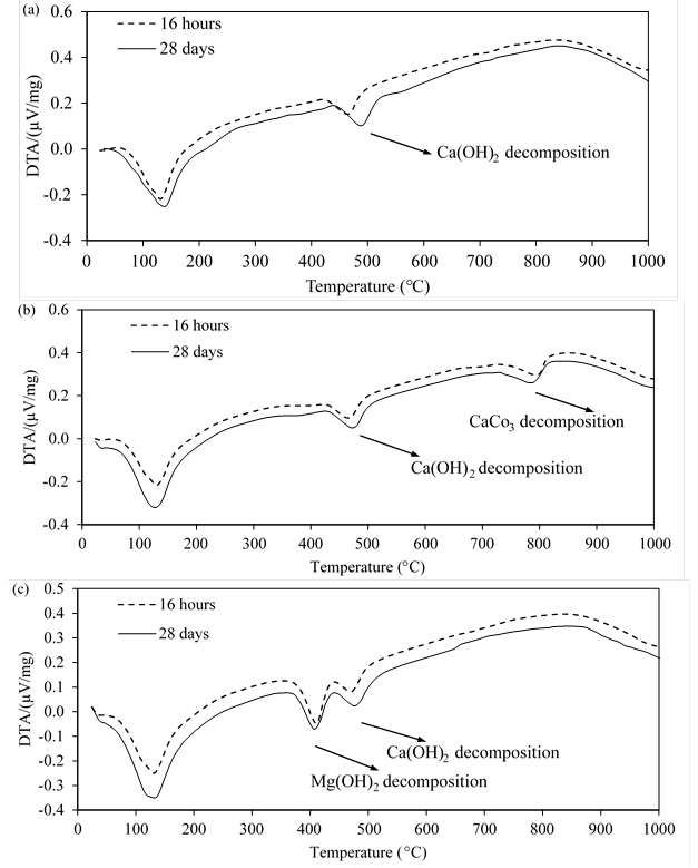 Calcium hydroxide (Ca(OH)2), calcium carbonate (CaCO3) and magnesium hydroxide (Mg(OH)2) contents were measured at 16 hours and 28 days using Thermal Gravimetric /Differential Thermal Analysis (TG/DTA). For each mix design, two TG/DTA tests were conducted. The tests were conducted using Netzsch SA Simultaneous Thermal Analyzer with a maximum temperature of 1100°C and 10°C/min heating rate. Ca(OH)2 content was used to evaluate the hydration products for each mixture. The paste samples were freeze-dried until a constant mass was achieved. In freeze-drying process, the paste samples were frozen in liquid nitrogen to stop the hydration reactions. Thereafter, the paste samples were placed under vacuum at -10°C. Under these conditions, the free water in the cement paste samples is transformed from a solid state to gas state without going through the liquid state. The use of freeze-drying instead of heat drying was to prevent the loss of any chemically bonded water.