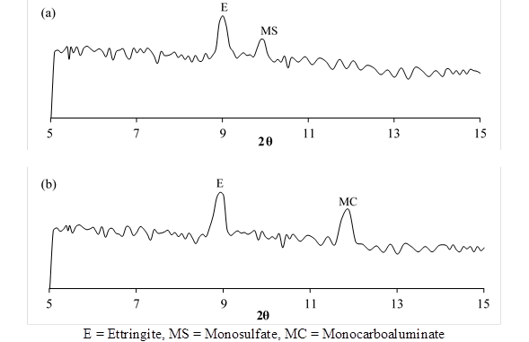 The x-ray diffraction was used to identify the calcium monocarboaluminate phase. At 28 days, paste samples were dried in a vacuum oven at 38°C for 24 hours. Prior to x-ray testing, the samples were crushed and sieved to obtain a powder with particle size of less than 45μm.