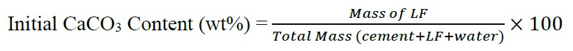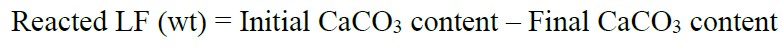 CaCO3 content was used to calculate the amount of LF that was consumed in the chemical reaction. The initial CaCO3 content (prior to mixing), expressed in percentage by weight (wt%), was calculated according to Equation 3. The final CaCO3 content was calculated using TG/DTA mass loss at approximately 680 to 800°C as presented in Equation 4 (Maria 2011). The amount of reacted LF was calculated using Equation 5.