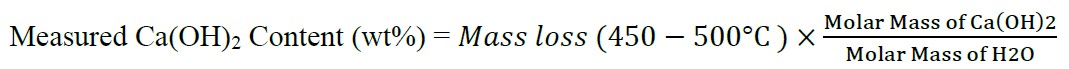 Similarly, the initial content of Mg was calculated using Equations 6. Mass loss corresponding to the decomposition of Mg between 350 and 400°C was used to calculate the final Mg content as presented in Equation 7. Ca(OH)2 content was measured using TG/DTA mass loss between 450 to 500°C as presented in Equation 8 (Maria 2011).
