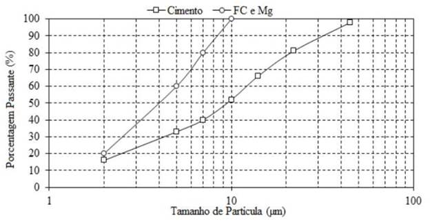 Foi utilizado cimento HE do tipo CSA, sem calcário intermediário. O cimento foi fornecido pela Lafarge Canada Inc. As propriedades físicas e químicas do cimento são apresentadas na Tabela 1. FC e Mg foram fornecidos pela Omya Canada Inc. e Aldon Corporation, respectivamente. A seleção do Mg foi baseada na reatividade química e dureza. O Mg é um material inerte e possui dureza Mohs semelhante (i.e., 3) em comparação com o FC (Moore et al. 2009, Santhanam 2013). A dureza do Mg e FC deve ser semelhante para evitar a introdução de uma nova variável nos resultados da resistência à compressão (Zhange et al. 2011). O FC apresentou uma finura de Blaine de 1125 m2/kg, tamanho médio de partícula de 3µm densidade de 2,7. O Mg fornecido apresentou uma finura de Blaine de 1450 m2/kg, tamanho médio de partícula de 4 µm e densidade de 2,4. Como a distribuição granulométrica e a finura de Blaine do FC e Mg fornecidos eram diferentes, ambos os materiais exigiram modificação na distribuição granulométrica para obter uma distribuição de granulométrica e finura de Blaine semelhantes. Esta modificação consistiu em peneirar FC e Mg usando peneiras de 10µm, 7µm, 5µm e 2µm e usar proporção igual retida em cada peneira. A peneiração foi realizada para garantir uma distribuição granulométrica semelhante de FC e Mg. Além disso, a porção de FC que passou na peneira de 2 µm foi moída, de modo que o produto final de FC tenha uma finura de Blaine semelhante em comparação com o Mg, 1450 ± 30 m2/kg. A distribuição granulométrica do cimento, FC e Mg é apresentada na Figura 1. O agregado miúdo (areia natural) e o agregado graúdo (calcário triturado) foram fornecidos pela Dufferin Aggregates. A densidade da areia é de 2,72 e o módulo de finura de 2,84. Foi utilizado o Plastol 6400, um redutor de água de alto alcance (RAAA), fornecido pela Euclid Chemical.