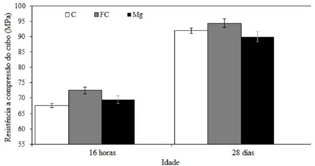 Os resultados da resistência à compressão do cubo das argamassas às 16 horas e 28 dias são apresentados na Figura 7. Cada coluna da figura representa a média de três ensaios. Os coeficientes de variação foram inferiores a 5%. Às 16 horas, a adição de FC e Mg aumentou a resistência à compressão do cubo em 7% e 3%, respectivamente. Aos 28 dias, a resistência de todos os traços foi aproximadamente semelhante (90 a 94 MPa).
