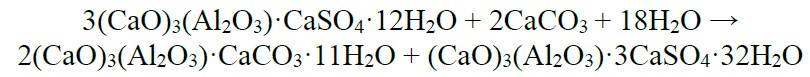 A interação química entre FC e outros produtos de hidratação foi debatida. No entanto, trabalhos de pesquisa nos últimos 20 anos provaram que o FC não é um material quimicamente inerte, mas sim um material parcialmente reativo (Hooton et al. 2007, Hawkins et al. 2003). O FC reage com o monossulfato ((CaO)3(Al2O3)·CaSO4·12H2O) e o hidrato de aluminato de cálcio ((CaO)3(Al2O3)·6H2O) para formar o mono-carboaluminato de cálcio (3CaO·Al2O3·CaCO3·11H2O), como apresentado nas Equações 1 e 2 (Kakali et al. 2000, Bentz 2006, Kuzel et al. 1996). As reações entre FC e monossulfato e hidrato de aluminato de cálcio ocorrem após a exaustão dos íons sulfato no sistema (Wang 2010). Além disso, a finura do FC influencia essas reações; quanto maior a finura do FC, mais FC é consumido nessas reações (Hooton et al 2007).