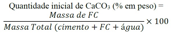 O teor de CaCO3 foi utilizado para calcular a quantidade de FC consumido na reação química. O conteúdo inicial de CaCO3 (antes da mistura), expresso em porcentagem em peso (% em peso), foi calculado de acordo com a Equação 3. O conteúdo final de CaCO3 foi calculado usando a perda de massa TG/DTA a aproximadamente 680 a 800 ° C, conforme apresentado na Equação 4 (Maria 2011). A quantidade de FC reagido foi calculada usando a Equação 5.