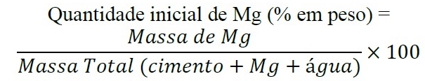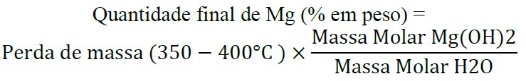 Da mesma forma, a quantidade inicial de Mg foi calculada usando as Equações 6. A perda de massa correspondente à decomposição de Mg entre 350 e 400 °C foi usada para calcular o teor final de Mg, conforme apresentado na Equação 7. A quantidade de Ca(OH)2 foi medida usando a perda de massa TG/DTA entre 450 e 500 °C, conforme apresentado na Equação 8 (Maria 2011).