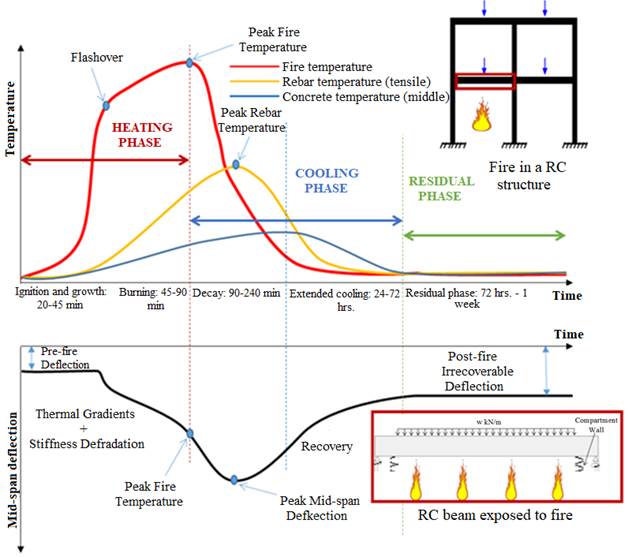 The extent of damage to concrete structures due to fire exposure is influenced by conditions existing just prior to the fire incident, as well as during complete fire exposure duration, including extended cooling phase when cross-sectional temperatures in the member reverts back to ambient conditions. The different phases encountered for a typical RC beam during and after a fire are illustrated in Fig. 1. Once the fire attains flashover, cross-sectional temperatures increase, and load carrying capacity decreases, together with rise in deflection due to temperature induced degradation in strength and stiffness of concrete and rebar. Furthermore, even as fire temperatures begin to decay during cooling phase, cross-sectional temperatures within the structural member remain significantly high for prolonged duration following burnout conditions or after fire is extinguished, owing to high thermal inertia of concrete. In fact, temperatures within the member may not cooldown to ambient conditions until 24 to 72 hours after fire has been extinguished, depending on size (thermal mass) of the member and fire severity. After the member cools down to ambient conditions, an unrecoverable deflection exists in the structural member. These residual deformations represent the state of structural damage in the member resulting from fire exposure and the extent of damage depending on load level, boundary conditions, and temperature induced degradation in material properties.