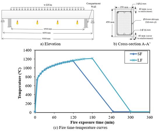 Various input parameters such as model geometry, load distribution, boundary conditions, fire scenarios and material properties are required to carry out different stages of analysis. The details of the beams and the time-temperature curves of the fire scenarios assumed for analysis are presented schematically in Fig. 3a-c.