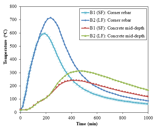Furthermore, cross-sectional temperatures in both beams continue to increase even as fire temperatures decay, owing to high thermal inertia of concrete. In fact, cross-sectional temperatures reach peak values during cooling (decay) phase of fire exposure in both beams. Peak rebar temperatures in B1 and B2 are calculated to be 592°C and 715°C at 170 min and 240 min respectively, well after heating phase of fire exposure has ended. Similarly, peak temperatures at concrete mid-depth are calculated to be 240°C and 315°C respectively. Therefore, the relatively less severe fire exposure adopted for beam B1 leads to relatively lower cross-sectional temperatures as compared to those experienced in beam B2. Nonetheless, both beams do not fail during fire exposure or during extended cooling phase after fire exposure.