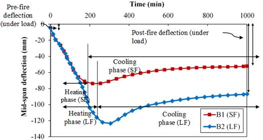 Both beams do not fail during fire exposure and mid-span deflections recover once the rebar and concrete temperatures revert back to ambient temperatures. This can be primarily attributed to the recovery in strength and modulus properties in reinforcing steel, once the beam enters the extended cooling phase. Also, recovery in mid-span deflection during the cooling phase of fire exposure is governed by cross-sectional temperatures, especially rebar temperatures.