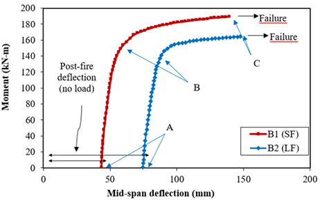 In Stage 1 of analysis, the room temperature design capacity of beams B1 and B2 were calculated to be 191 kN-m as per ACI 318 (ACI, 2008) design equations. In addition, the realistic room temperature capacity of the RC beams prior to fire exposure, using finite element analysis when strain hardening and no material reduction factor is applied, was calculated to be 250 kN-m.