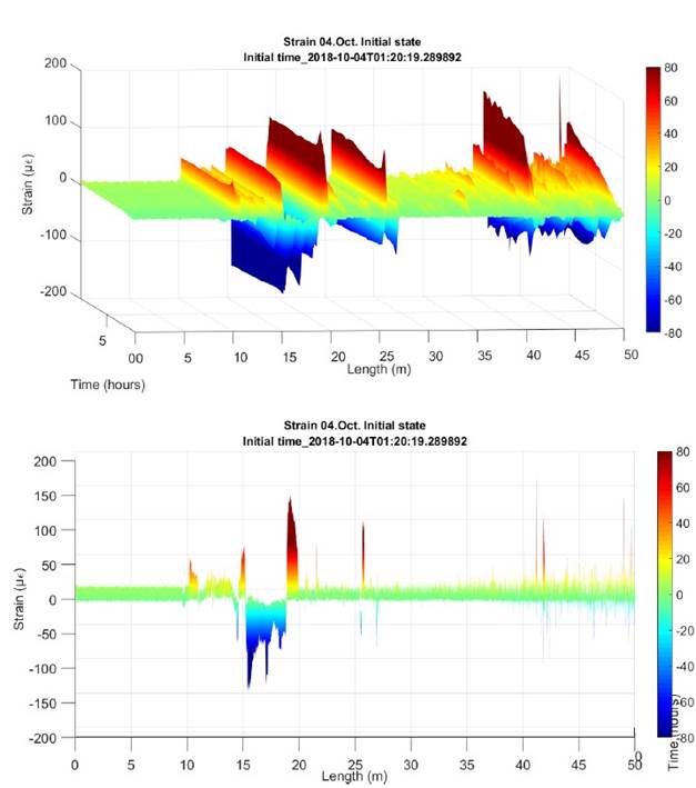 Da mesma forma, podem ser observados picos e/ou descontinuidades obtidos com o monitoramento, que correspondem às áreas de ligação entre trechos dos segmentos onde a fibra ótica sofre uma desaderência com o concreto, já desde sua implantação na origem. Esses picos permanecem estáveis no que diz respeito à sua localização.
