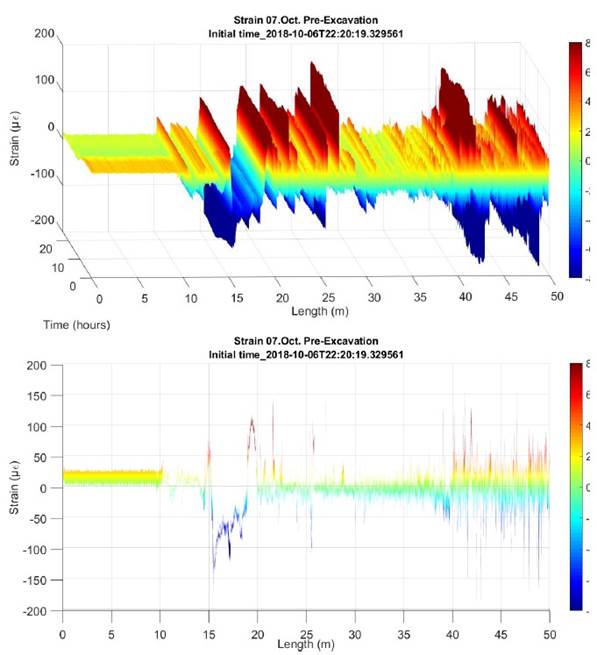 Asimismo, se pueden apreciar picos y/o discontinuidades obtenidas de la monitorización, los cuales corresponden a las zonas de junta entre tramos de las dovelas donde la fibra óptica sufre una desadherencia con el hormigón, ya desde su implantación en origen. Estos picos permanecen estables en lo que respecta a su ubicación.