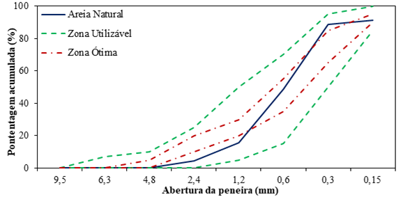 Foi utilizado o agregado miúdo natural (areia), de origem quartzosa, da região Metropolitana de Recife/PE. A areia natural foi adquirida por uma empresa levando em consideração as características físicas da mesma. O material estava em estado úmido e, portanto, foi necessário corrigir o teor de água por secagem natural. Para garantir o teor de umidade, 600 g de material foram dispostas numa estufa por cerca de 24 horas a uma temperatura de 100°C ± 2°C e, após este procedimento, 300 g foram utilizados para o teste de caracterização granulométrica levando em consideração a granulometria do agregado miúdo de acordo com a norma NBR NM 248 (ABNT, 2003). Nesse contexto, foi necessário analisar a zona ótima de utilização do agregado miúdo (areia), pois o mesmo pode influenciar na densidade ideal do composto cimentício (concreto). Através da distribuição granulométrica dos agregados, foi possível obter parâmetros como MF - (módulo de finura) de 2,93 e Dmáximo - (diâmetro máximo) de 4,5 mm, sendo classificado como agregado miúdo com grãos médios bem distribuídos. Os resultados podem ser vistos na (Figura 1).