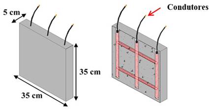 A metodologia utilizada para desenvolver este estudo, foi organizada para desenvolver condições para compreender o comportamento de elementos leves de concreto armado (concreto celular) sob o processo de corrosão das armaduras. Ao longo do processo, os elementos do material foram avaliados através de testes eletroquímicos (potenciais de corrosão e resistividade) e testes físicos em barras de aço (perda de massa e resistência à tração). Os corpos-de-prova foram desenvolvidos na forma de uma placa, (35 cm de largura x 35 cm de altura x 5 cm de espessura) como pode ser visto na (Figura 2).