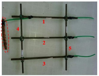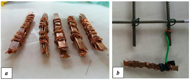 Dois procedimentos foram utilizados para induzir a corrosão das barras de aço contidas nas placas de concreto. O primeiro procedimento, chamado (tipo 1), aplicava o princípio da corrosão galvânica. O cobre funciona como um cátodo e o aço torna-se o ânodo, perdendo elétrons (corrosão). Além disso, o material foi conectado à malha de aço (Figura 5 (a) e (b)) de cada placa, localizado no fundo da fôrma.