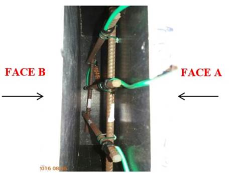 A fim de verificar o revestimento das barras de aço em ambas as faces das placas após a concretagem, foi utilizado equipamento baseado em sensores eletromagnéticos. Este equipamento, o Ferroscan PS200 da Hilti, foi utilizado para estimar a média de revestimento das barras em cada uma das placas. Além disso, algumas imagens foram feitas para verificar o posicionamento das barras. A e B foram nomenclaturas dadas às faces das placas para representar o posicionamento da malha de aço, conforme indicado na (Figura 7).