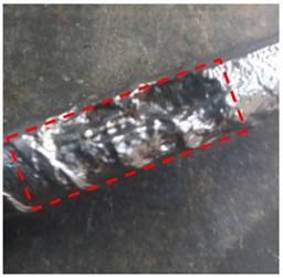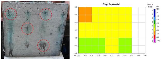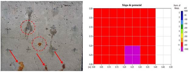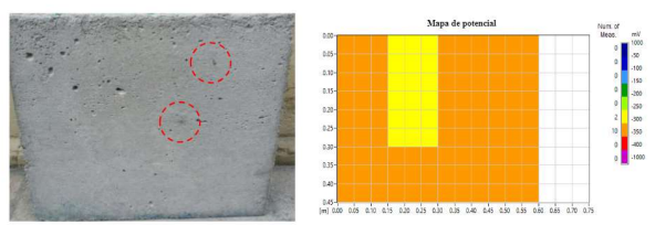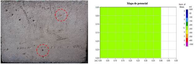 Os pontos mais escuros vistos após o teste, mostram as regiões onde as leituras foram feitas em uma área de (10 cm x 10 cm). Entre as 12 medições do potencial de corrosão, 10 se enquadram na região de incerteza, mas com valores próximos à região segura. Os outros dois pontos estão dentro de uma área com menos de 10% de probabilidade de ocorrência de corrosão.