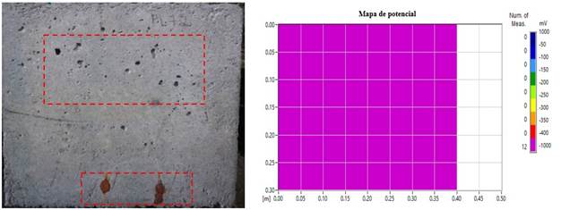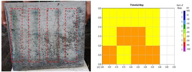 No que diz respeito ao comportamento físico das placas de concreto, percebeu-se que a solução de Na+Cl- - cloreto de sódio desencadeou o processo de corrosão das barras de aço, onde alguns pontos manchados puderam ser vistos na superfície das placas. Na (Figura 11 (a) e (b)), correspondente as placas da família R, não foram evidenciados um alto nível de degradação e o mapa do potencial de corrosão afirmou que os valores variaram entre -350 mV a -400 mV.