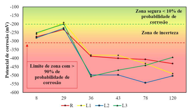 Na terceira leitura (aos 36 dias), é possível verificar uma queda repentina no potencial de corrosão, especialmente para as famílias mais porosas (L2 e L3). Ao comparar a família L3 com a família R, pode-se ver que a medida do potencial de corrosão a 120 dias é menos eletronegativa, mostrando -394 mV comparado ao resultado da família R que é -431 mV, ou seja, 9% menos que a família R, ocorrendo devido à alta atividade eletrolítica dos íons cloreto.