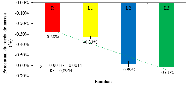 A perda total de massa das barras de aço por família seguiu uma sequência, como mostrado na (Figura 18). As famílias L2 e L3, além de demonstrarem valores potenciais de corrosão mais eletronegativos, bem como um grau visual mais degradado (quantitativa e qualitativamente), também obtiveram maior perda de massa de aço (valores absolutos e percentuais).