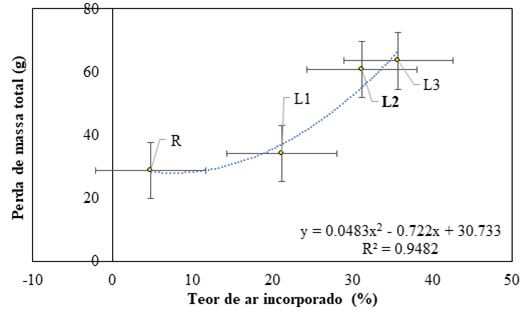 Na (Figura 22), observa-se que quanto maior a percentual de ar incorporado no interior do composto cimentício (concreto celular), maior é a perda total de massa das barras de aço, pois o índice de vazios facilita a entrada de agentes agressivos. Ao observar a interação das variáveis dependentes e independentes, percebeu-se que o avanço dos produtos da corrosão frente ao teor de ar incorporado cresce exponencialmente como pode ser analisado pelo R² = 0,9482.